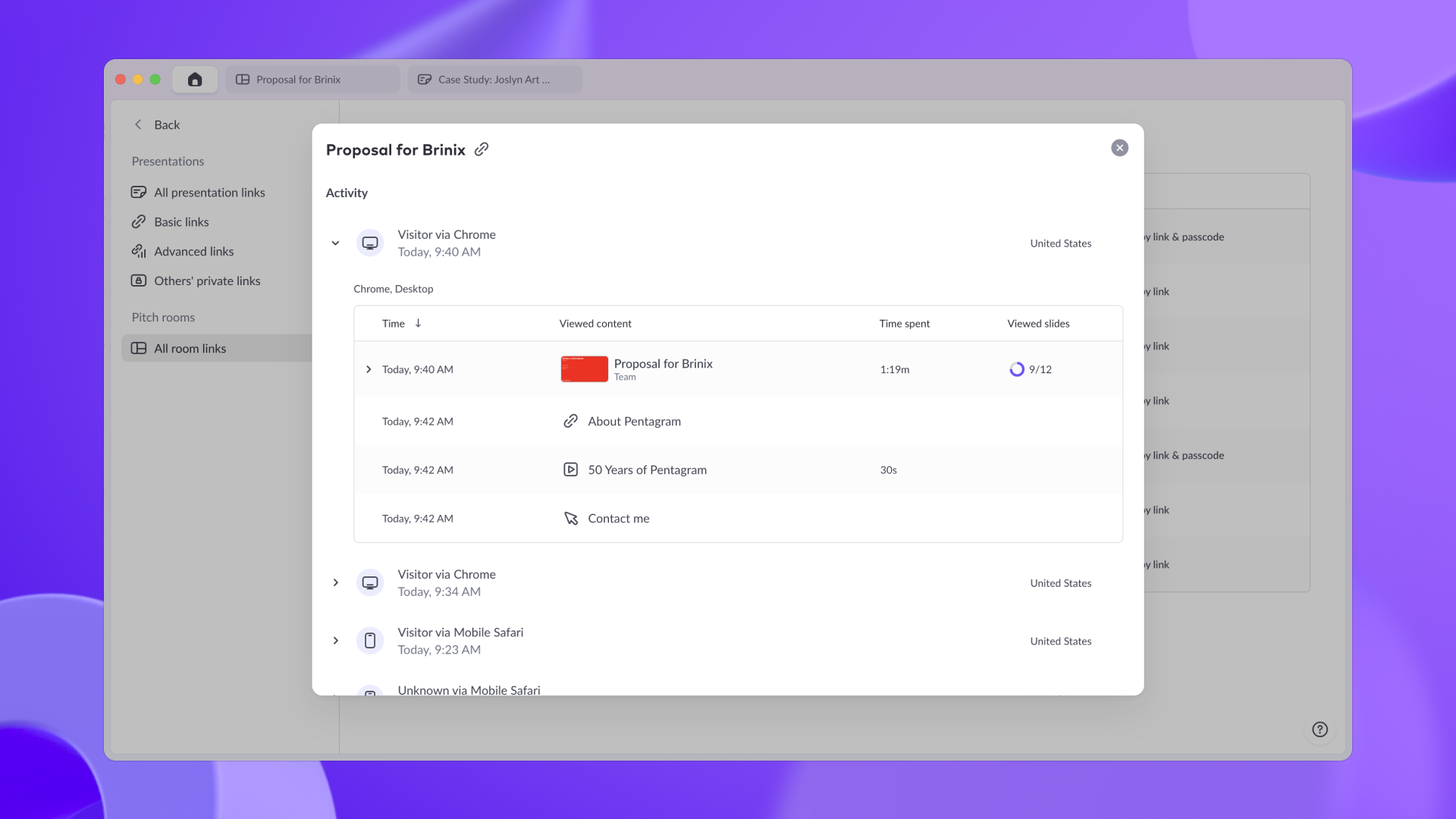 But Pitch isn’t just helping them create sleek decks. It’s helping them win work. Before, Tara had no way of knowing how clients were engaging with the content, or in what order. Now, after generating a custom link for a room and sending it off to a prospect, the team is able to track real-time client engagement — like if someone visits a room, opens a deck, or clicks on an asset or call-to-action button.